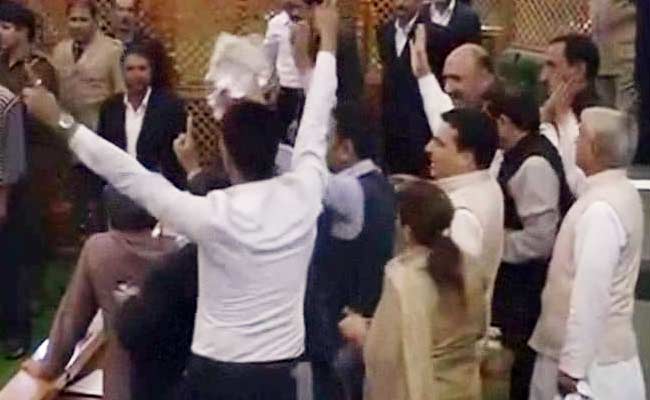 A few of them were stopped by marshals as they charged towards the treasury benches. The National Conference and Congress members were joined by independent MLAs Shiekh Abdul Rashid and Hakim Mohammad Yasin.