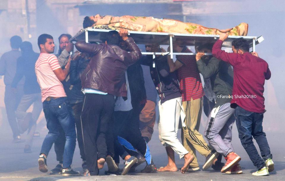 About two dozen youth were hit by pellets in forces firing during clashes as people tried to march towards encounter site in Panzan village of Chadoora in Budgam today.