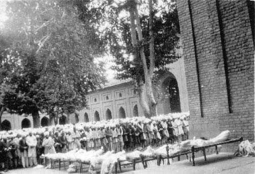 The trial of Abdul Qadir was ordered but fearing disturbances and disruption, the high profile case was tried in the courtyard of Srinagar Central Jail where thousands of Muslims gathered awaiting the result of the trial. On July 13, 1931, while the trial was in progress, the time of Zohar (afternoon) Prayers approached. A young man arose for Azaan (call for prayers) but he was shot dead by Dogra policemen. Another young man tried to continue the “Azan”, but he too was shot dead. Till the completion of the Azaan twenty one Kashmiris embraced shahadat in the process. The incensed crowd paraded their mortal remains on their shoulders, demanding justice but to no avail.