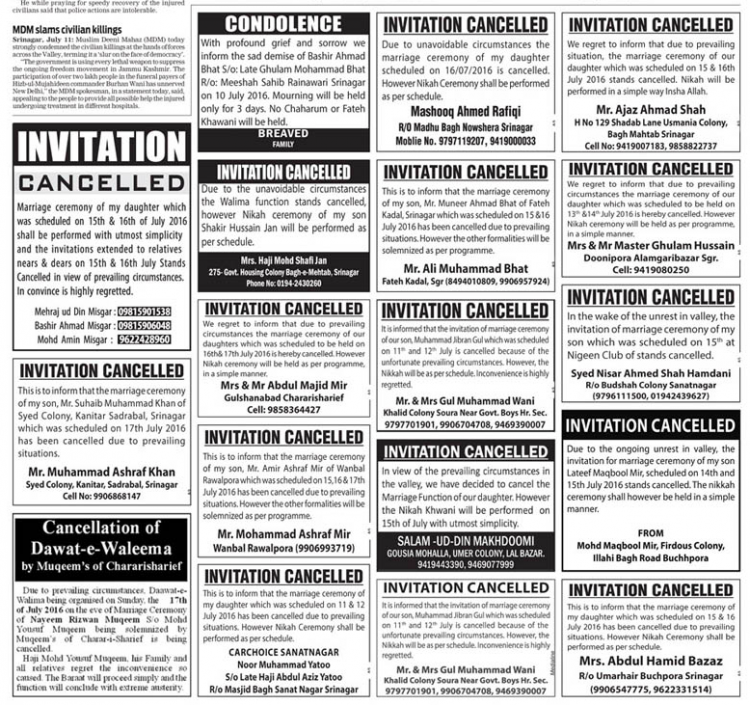 The violence in Kashmir has hit the post-Ramadan wedding season, with newspapers carrying notifications announcing the cancellation of feasts and invites. This started on Sunday (July 10th) , when editions of most of the newspapers carried classified advertisements on the cancellation of wedding invitations. The ads announced the weddings would take place with utmost simplicity, a PTI report said. Bilal Ahmad, a resident of Lal Bazar, said a big feast had been planned for his cousin’s wedding on July 11 but he was forced to cancel invites because of the…