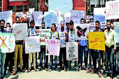 ‘Govt can’t adopt double standards on pretext of freedom of choice’ Scores of students from various educational institutions on Thursday held a sit-in to press for ban on sale of liquor in Kashmir. The protesters assembled at Pratap Park and staged protests. “Government is reluctant to impose ban on sale and trade of liquor in Muslim majority state in the name of freedom of choice. Government cannot adopt double standards in the matter of freedom of choice,” they said. “Government is promoting liquor in the state in the name of…