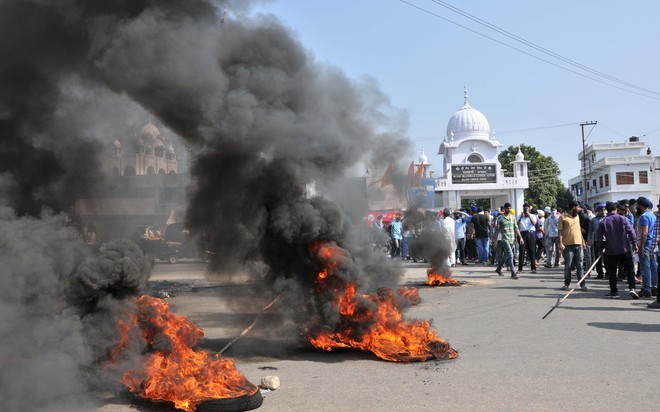 The Sikh community in Jammu and Kathua districts today held protest demonstrations and blocked the Jammu-Pathankot highway at different places against the killing of two Sikh activists in the police firing following desecration of the Guru Granth Sahib in the Kotkapura area of Punjab. The protesters also torched effigies of the Akali-BJP coalition and the Punjab Police and demanded registration of an FIR under section 302 IPC against the responsible policemen. They also sought a compensation of Rs 50 lakh each for the victims’ families. In Jammu, Sikh activists from…