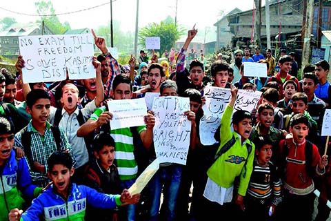 Govt says priority is to save previous year of students Stating that they would not appear in examinations, hundreds of students Saturday staged protest demonstrations across Kashmir. Students raised ‘Examination boycott’ slogans and accused government of “exploiting school going children for political gains.” Hundreds of students marched from Sozaith, Narbal and adjoining areas towards Srinagar raising anti-examination slogans. “Government has to create conducive atmosphere for exams. It can be created by stopping civilian killings, end to use of pellets, releasing all political leaders and students,” said Abid Ahmad, a protestor.…